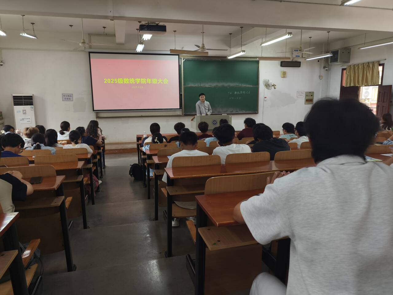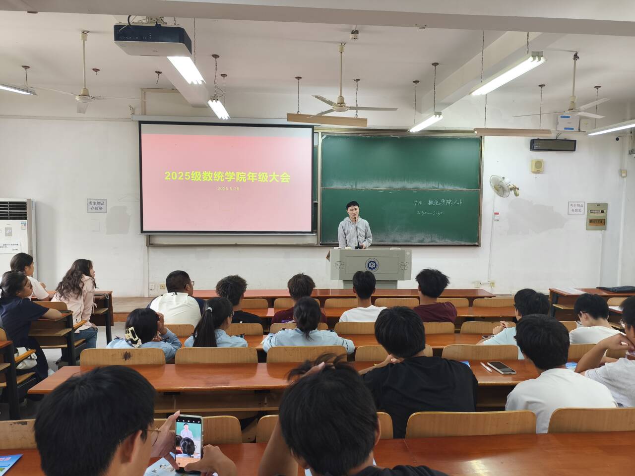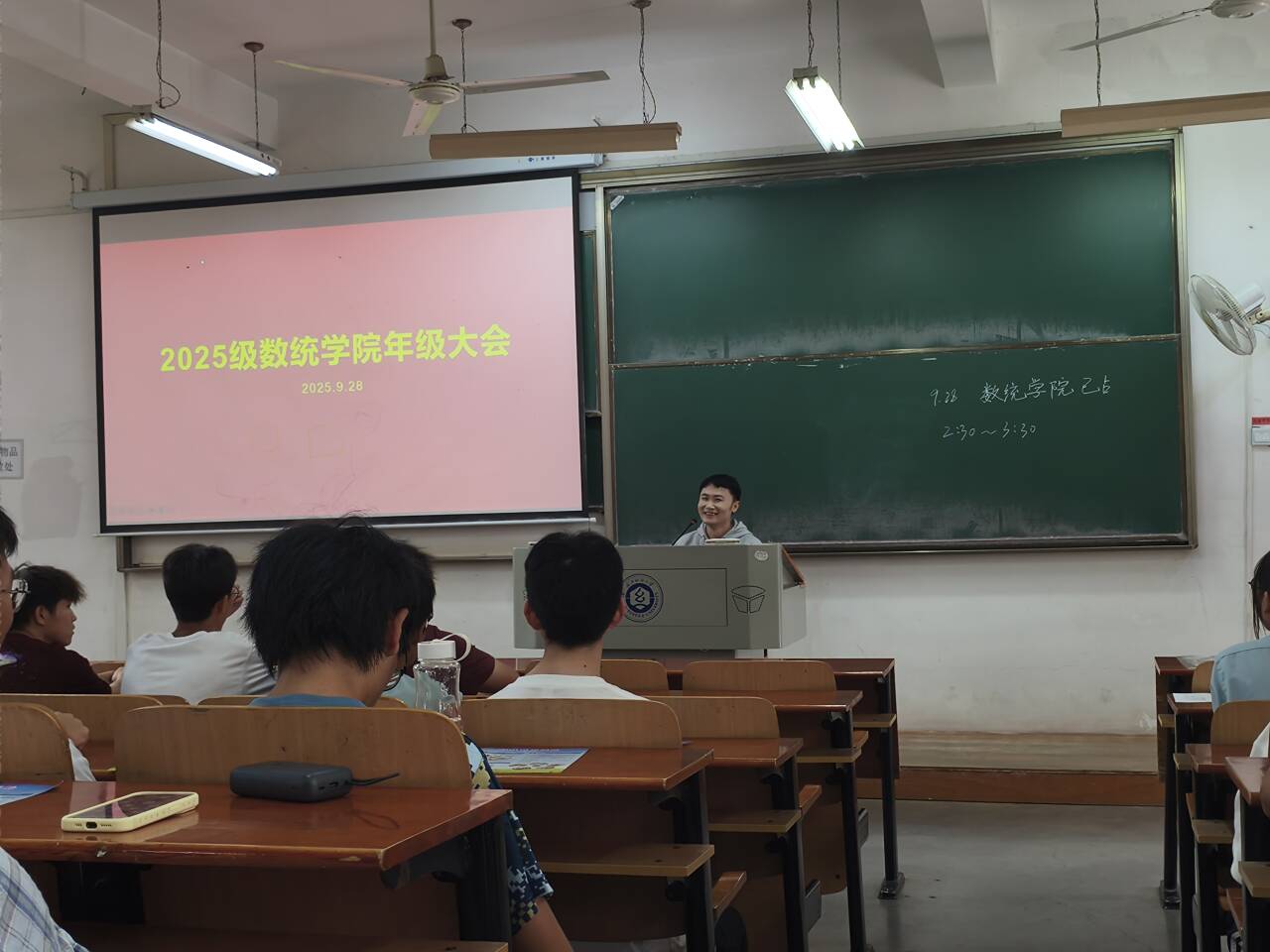 为帮助 2025 级新生更快适应大学生活,明确校园生活关键注意事项,9 月 28 日,数统学院在崇志楼119召开 2025 级年级大会。本次大会由辅导员曾琦主持,围绕新生关心的大学生医保、国庆放假安排、宿舍安全管理及防诈骗教育四大议题展开,为新生们送上了一堂实用且全面的 “校园生活指导课”。