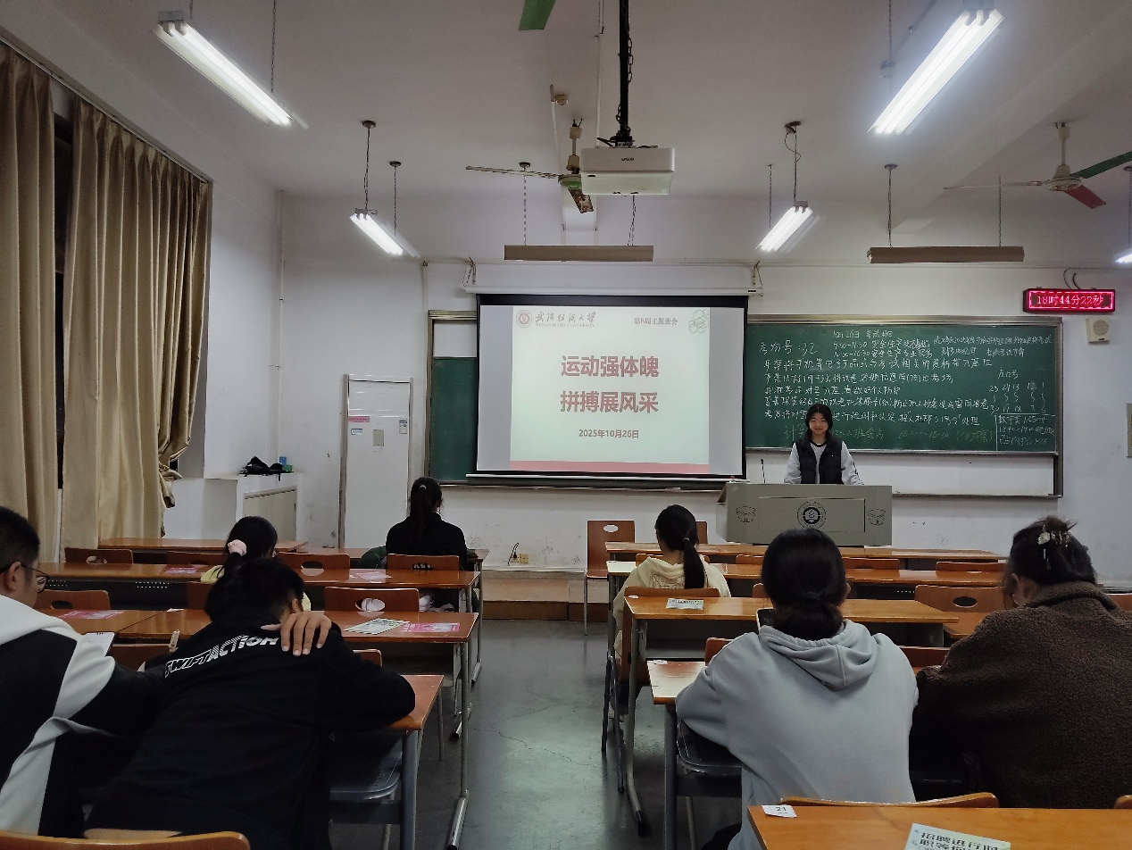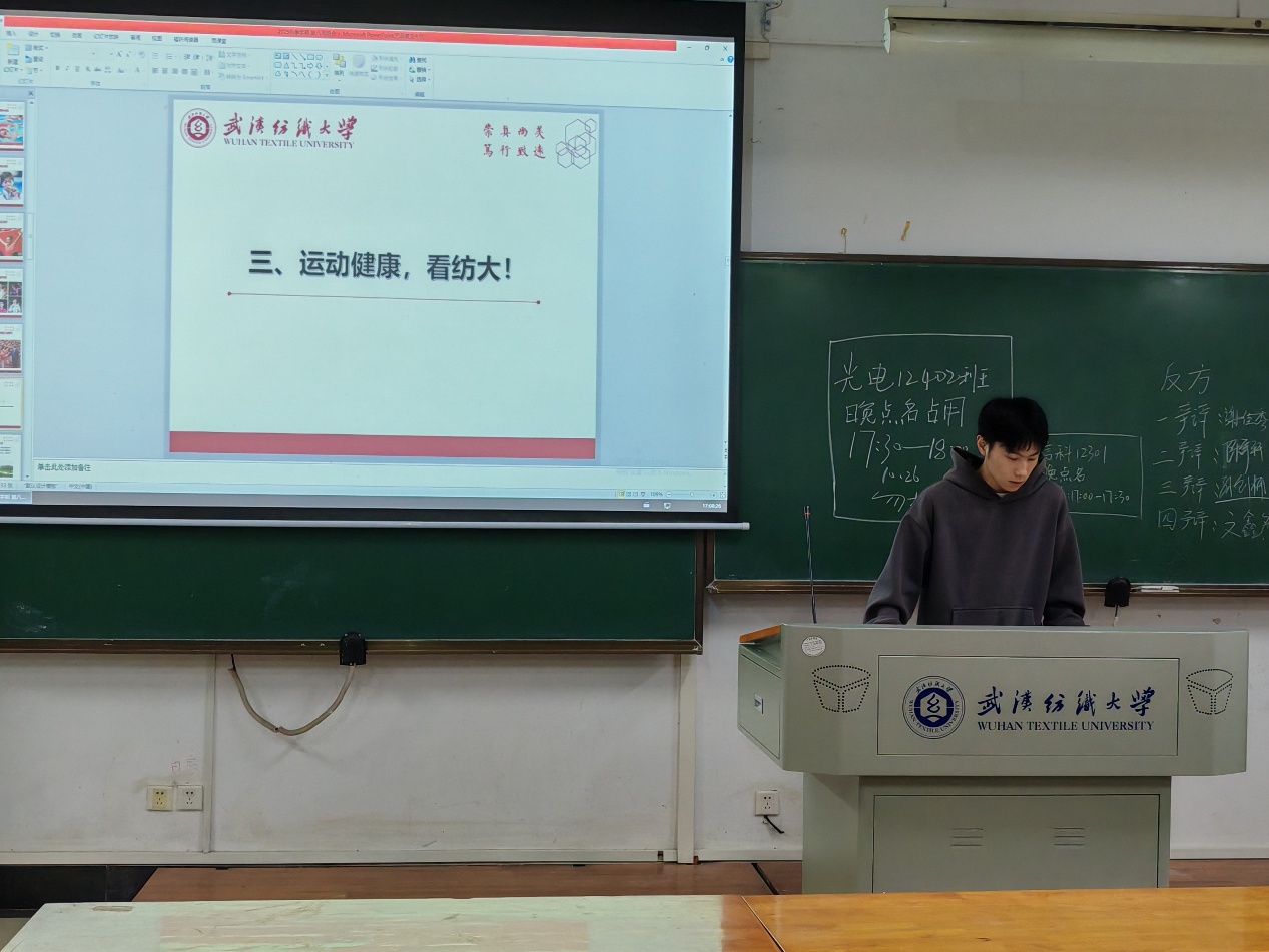 班长引出武汉纺织大学运动会,介绍举办时间、赛事项目与报名方式,指出其是校园体育文化重要部分。分享往届成人直播平台