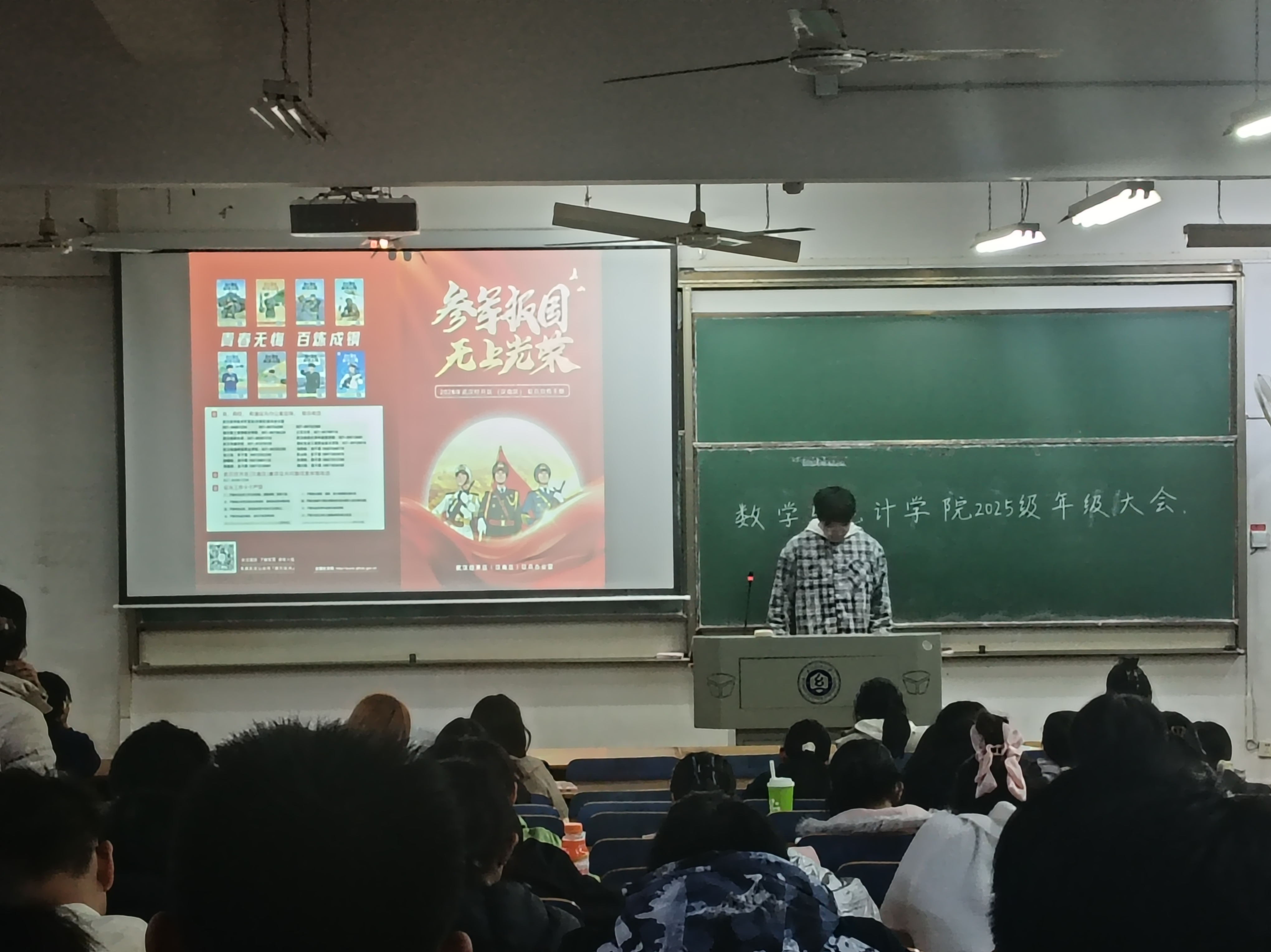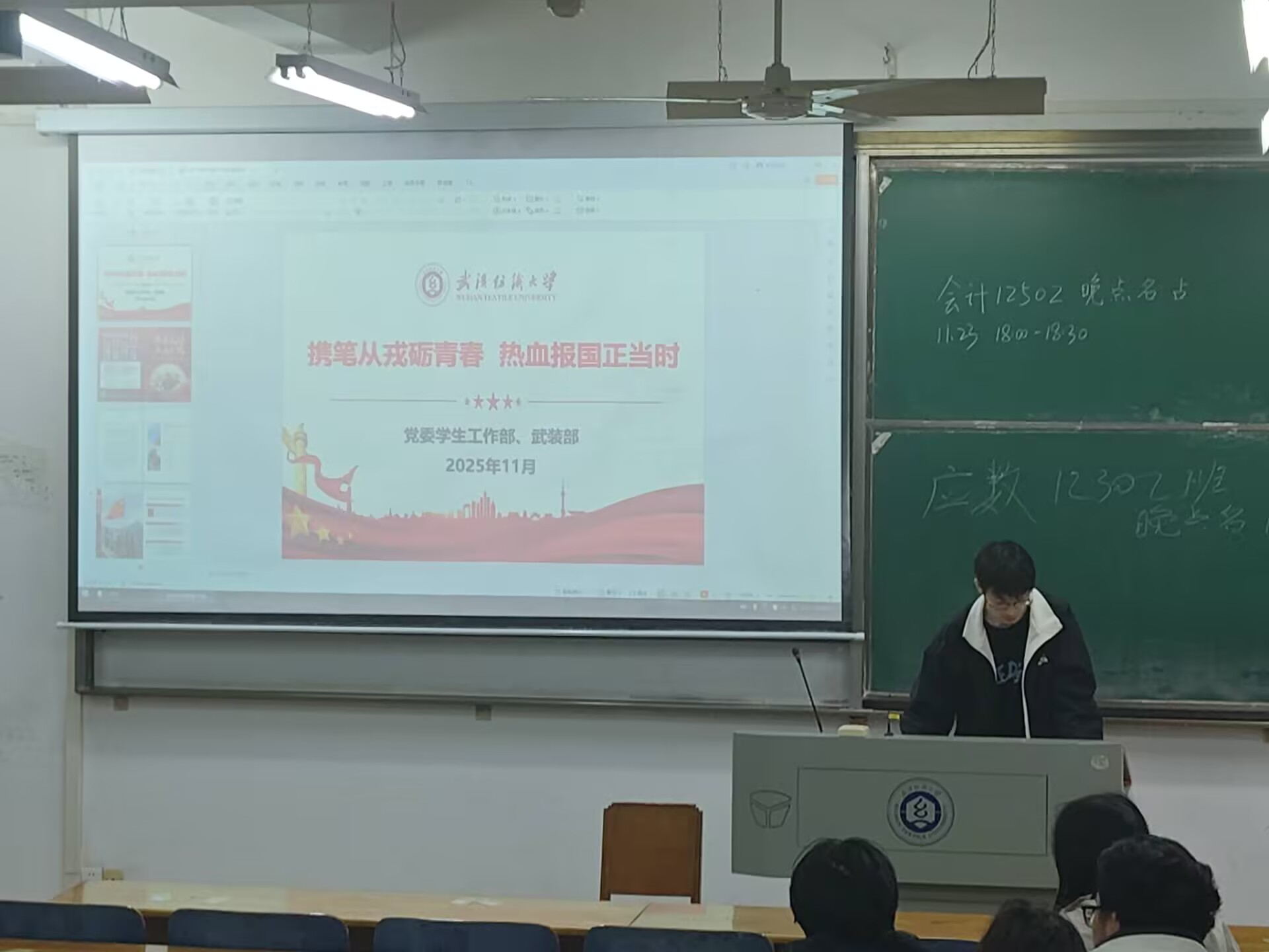 于2025年11月23日在崇志楼开展了以“携笔从戎立青春,热血报国正当时”为主题的班会,班会由各班班长主持,全体同学参加。