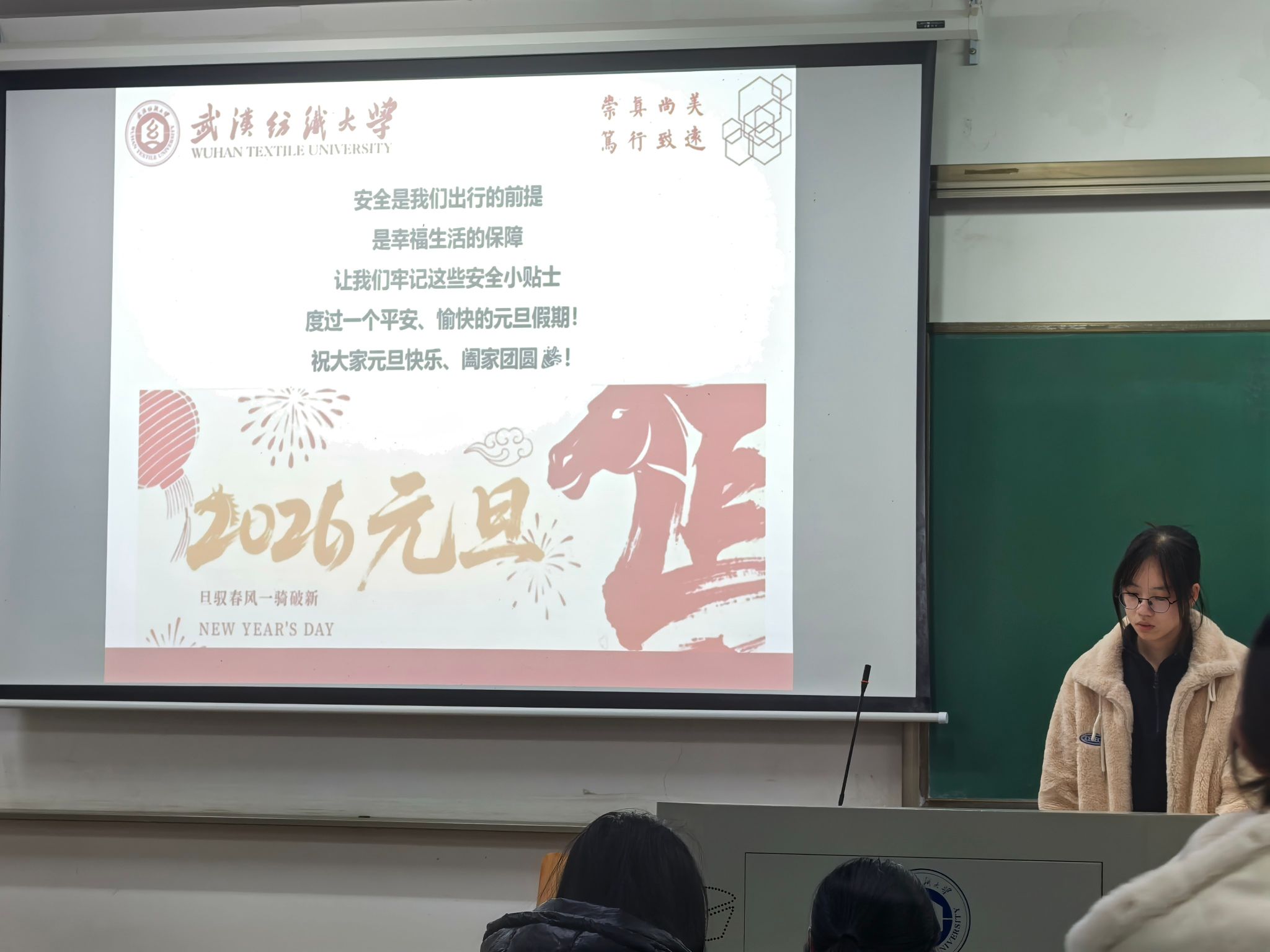 各班班长通过PPT展示元旦节放假通知的具体内容,明确了假期时间安排,并结合学院实际,对假期前后的教学衔接、学生离校返校管理提出要求。同时,针对元旦假期的交通安全、消防安全、人身财产安全等重点事项进行强调,提醒学生增强安全防范意识,合理规划假期行程。