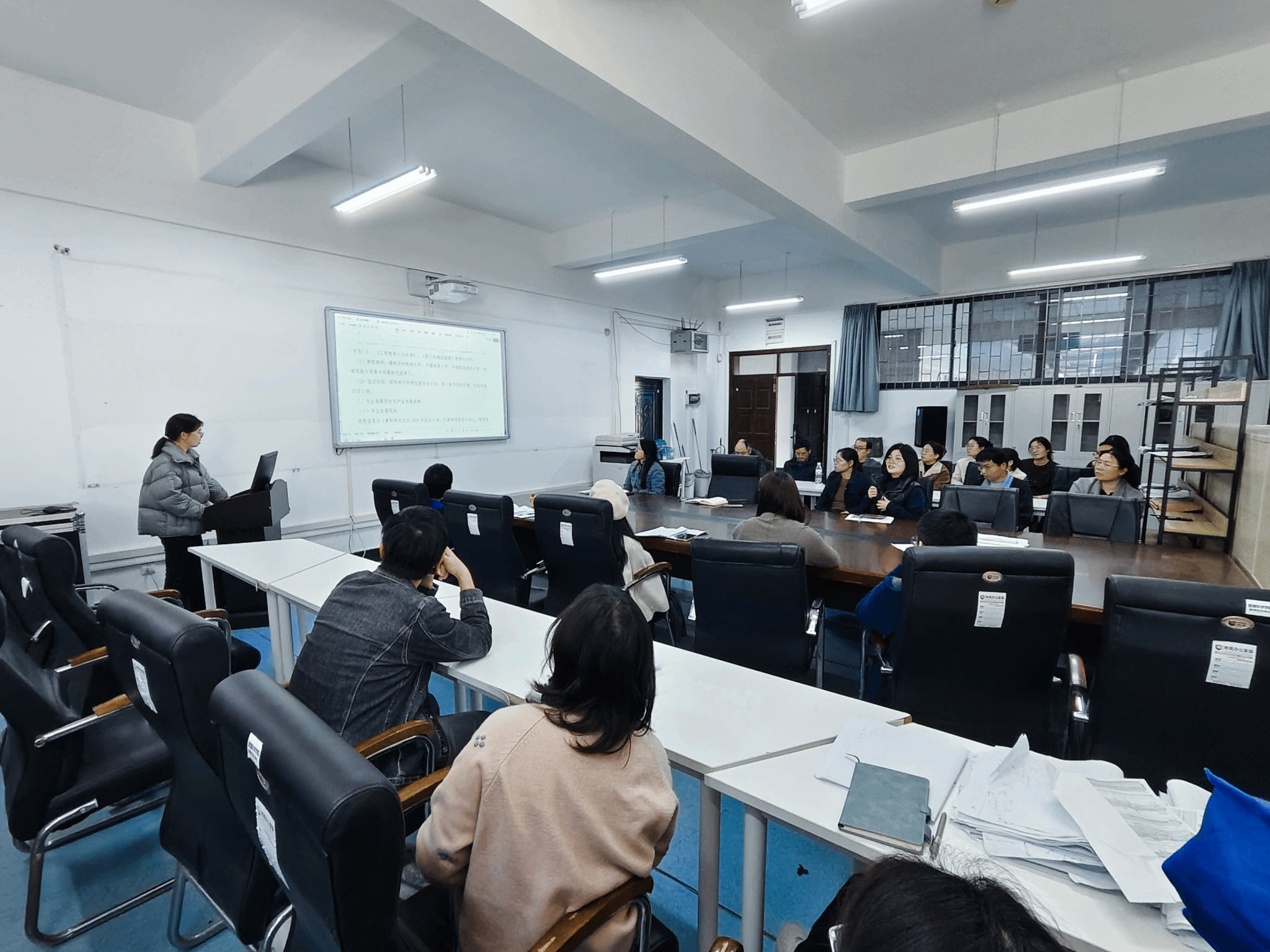 汇报结束后,各位专业教师各抒己见、热烈讨论。老师们结合教学实践,围绕课程设置调整、实践教学体系构建、产教融合路径探索等方面提出诸多建设性意见。意见包括增加数学分析课程的课时量,贴合纺织产业数字化升级中的数据分析需求;加强校企合作,搭建实践教学平台,提升学生应用数学知识解决实际产业问题的能力。大家一致认为,调研报告需进一步补充数据依据,结合学科特点细化培养建议,让人才培养方案更具针对性和实用性。