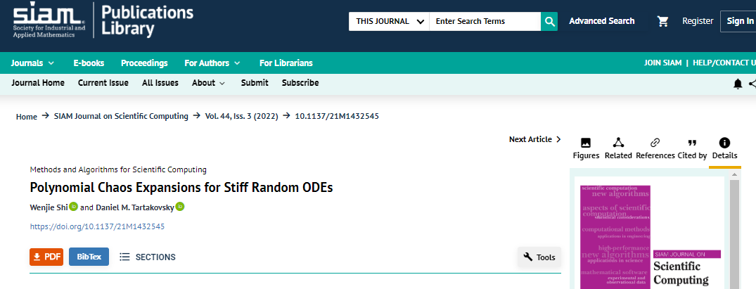 近期,成人直播平台动力系统研究团队史文杰副教授与其合作者在随机微分方程数值解方向取得重要研究进展,相关成果以“Polynomial Chaos Expansions for Stiff Random ODEs”为题在该领域国际知名期刊SIAM Journal on Scientific Computing上发表。该期刊是计算数学领域国际知名期刊,是中国科学院数学大类2区Top期刊。该论文的第一单位为武汉纺织大学,第一作者为武汉纺织大学成人直播平台史文杰副教授。