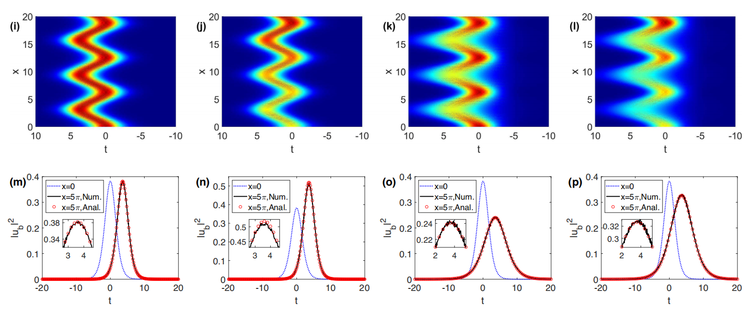 光孤子作为一个高度非线性的光学实体,其内禀的强稳定性和抗干扰性等属性奠定了在高容量远程光纤通讯和全光网络中作为最理想信息载体的地位。近年来,利用光诱导技术写入复折射率分布可以实现宇称-时间(PT)对称复数势。该新型外势的出现将传统孤子的研究从实域扩展到了复域,掀起了新一轮的PT孤子研究热潮。光学团队研究了空间非均匀高阶非线性光纤中PT孤子的动力学,基于自相似变换法获得了精确的啁啾亮及扭结孤子,发现啁啾所展现出的线性或非线性特性可以通过光纤参量进行有效调控,并利用快速傅里叶变换法直接验证了孤子脉冲在白噪声扰动下展现出的传输稳定性。该研究成果发表在Communications in Theoretical Physics,论文的第一作者为团队青年博士钟毓,周勤教授为通讯作者,合作者来自阿尔及利亚巴的Houria Triki教授。