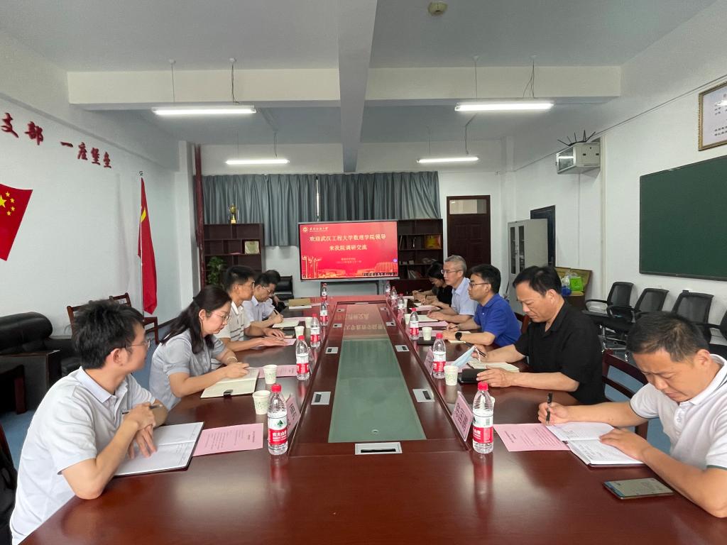 5月31日下午,武汉工程大学数理学院党委书记陈君、院长陈相柏等一行5人来学院调研,学院党委书记段溢波、院长汪胜祥、副院长许明耀、副院长郑仟、党委副书记陈国鹏、应数系主任江健参加调研交流会,会议由汪胜祥院长主持。