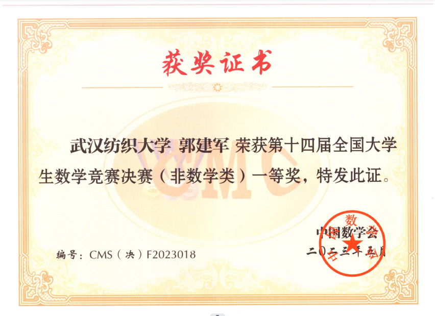 一直以来,郭建军同学认真务实地学习,毛耀博士利用大学生数学竞赛辅导课和大量课余时间辅导郭建军等同学学习数学。在努力学习和系列考试后,郭建军同学在去年11月底的湖北赛区的初赛中以优异的成绩进入决赛。从去年12月初到参加决赛前,毛耀博士为郭建军同学做好精心辅导与详细规划,并按照计划落实到具体学习,为此次获奖奠定了扎实基础。郭建军同学作为湖北赛区的23名选手之一晋级到全国决赛,在全国决赛中,沉着应战、稳扎稳打,最终取得全国一等奖,充分展现了我校学子的学习风采。