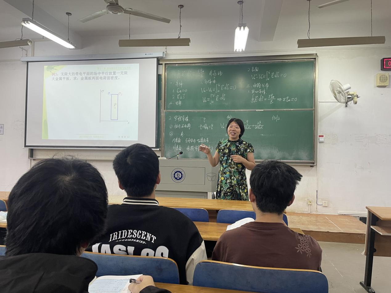 冯存芳老师讲授的课程是《大学物理BⅡ》,主题是“静电场中的导体”。冯存芳老师对教学内容、教学方法等进行了精心设计,在课堂教学中,多媒体课件和板书相结合,讲课思路清晰、表达自然,师生互动积极,课堂气氛活跃,充分调动了学生学习的主动性和兴趣。