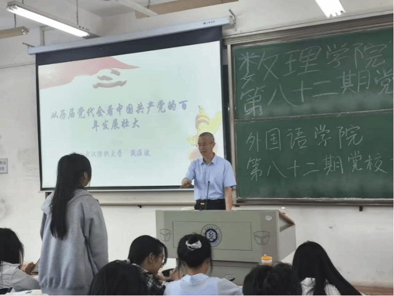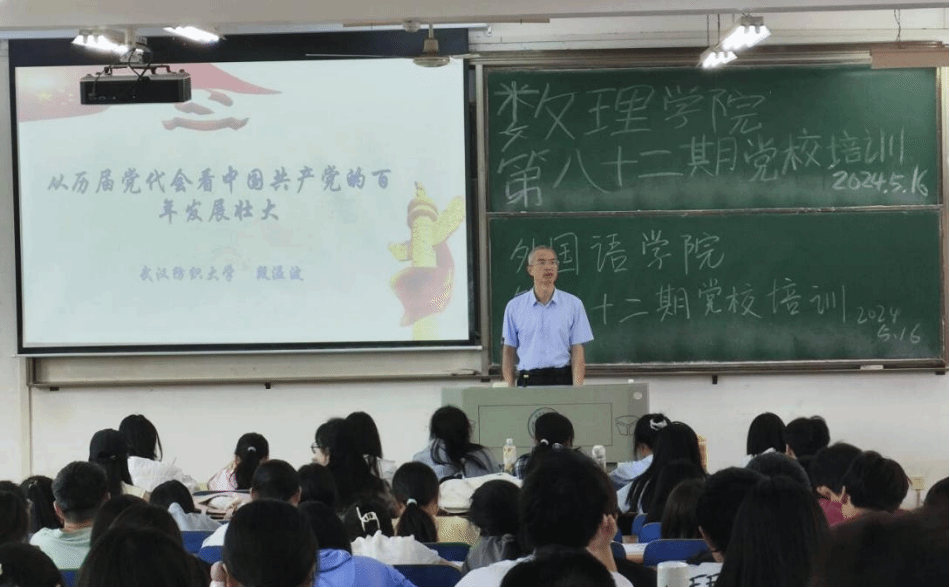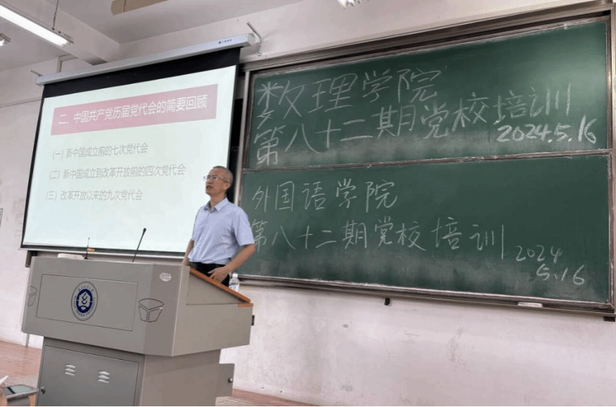 为了加强入党积极分子的理论学习,坚定理念信念,端正入党动机,2024年5月16日下午,成人直播平台党委书记段溢波以“以历届党代会看中国共产党的百年发展壮大”为题,在3教117教室为成人直播平台和外国语学院的入党积极分子讲授党课。