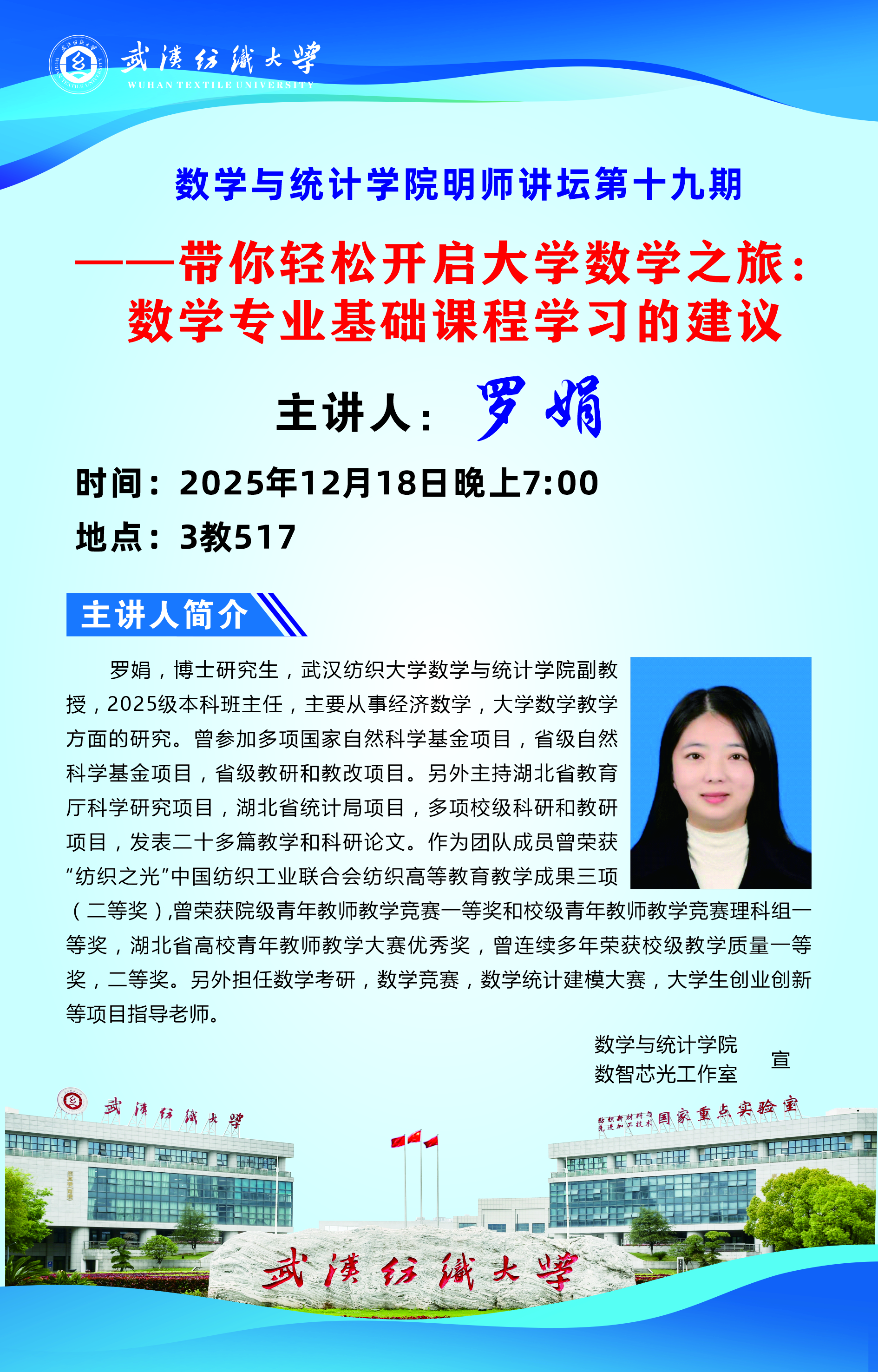 “明师讲坛”系列活动在武汉纺织大学三号教学楼517室成功举办。本次讲座邀请到了深受学生喜爱的《数学分析》主讲教师——罗娟老师,以“夯实基础,规划未来——与大一同学谈数学学习与成长”为主题,与在场学子进行了一场真诚而富有启发的交流。讲座现场座无虚席,气氛温馨热烈。